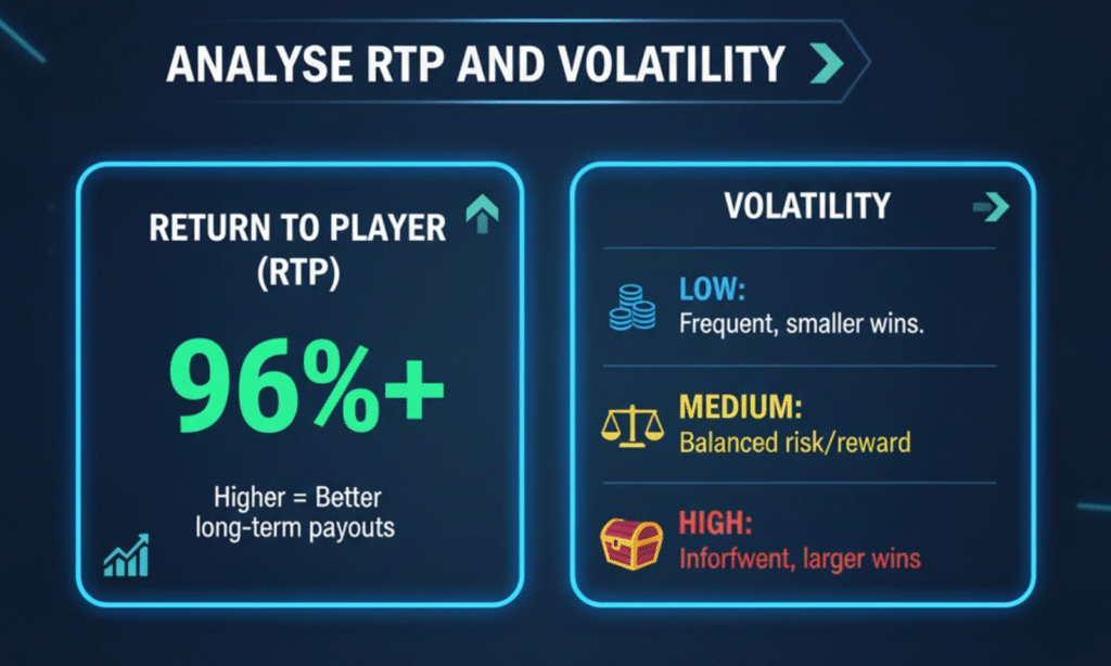The Return to Player (RTP) shows the average payout percentage, while volatility determines payout frequency. High RTP with medium volatility usually offers balanced gameplay and steady returns.